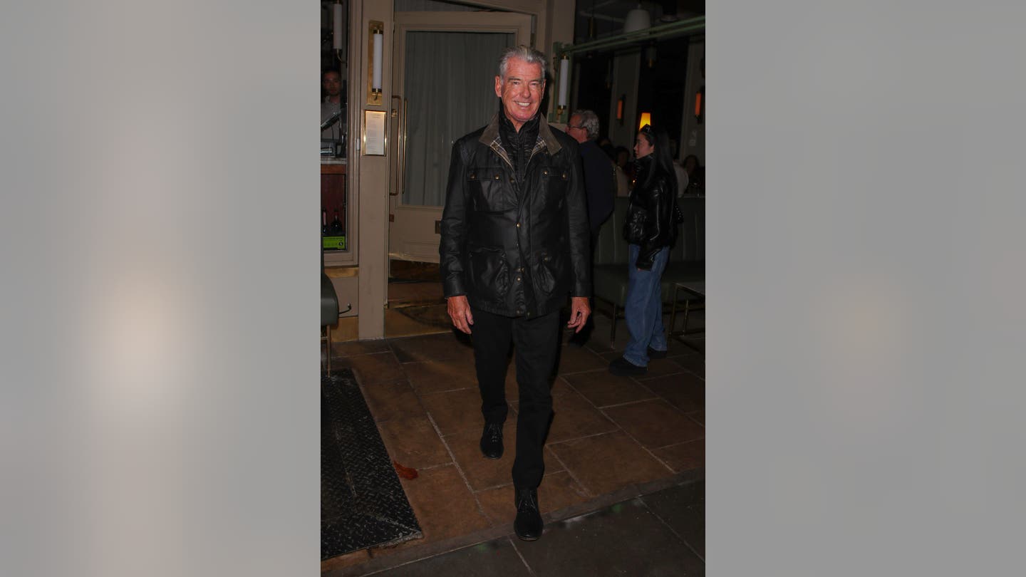 Brosnan parecia estar de bom humor enquanto sorria amplamente ao sair do restaurante.