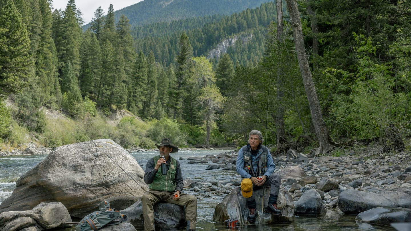 Em outro, o personagem de Russell, Preston Claiborne, senta-se no tronco de uma árvore e olha para longe. Outras imagens mostram Russell com Fox pescando com mosca em um riacho em Montana.