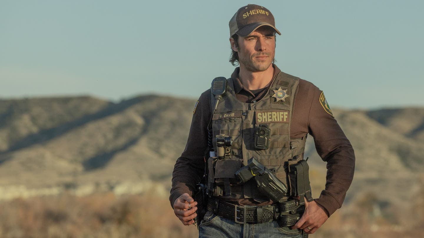 Schnitzer interpreta Van Davis, o prefeito de Montana. Uma foto o mostra vestindo uma jaqueta de arma, jeans e chapéu de xerife.