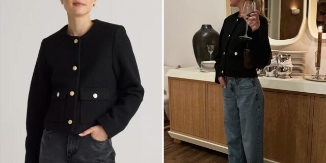 O Casaco curto sem gola confeccionado em lã merino Quince tem o apelo inerentemente elegante que define a tendência, realçado por detalhes luxuosos como botões dourados e bolsos quadrados com aba. Escolhi a versão preta, mas também está disponível em uma versão igualmente usável marfim E cinza. Surpreendentemente, experimentei pela primeira vez uma peça da marca popular dos editores e fiquei impressionado com o ajuste no tamanho real e o comprimento perfeitamente cortado.