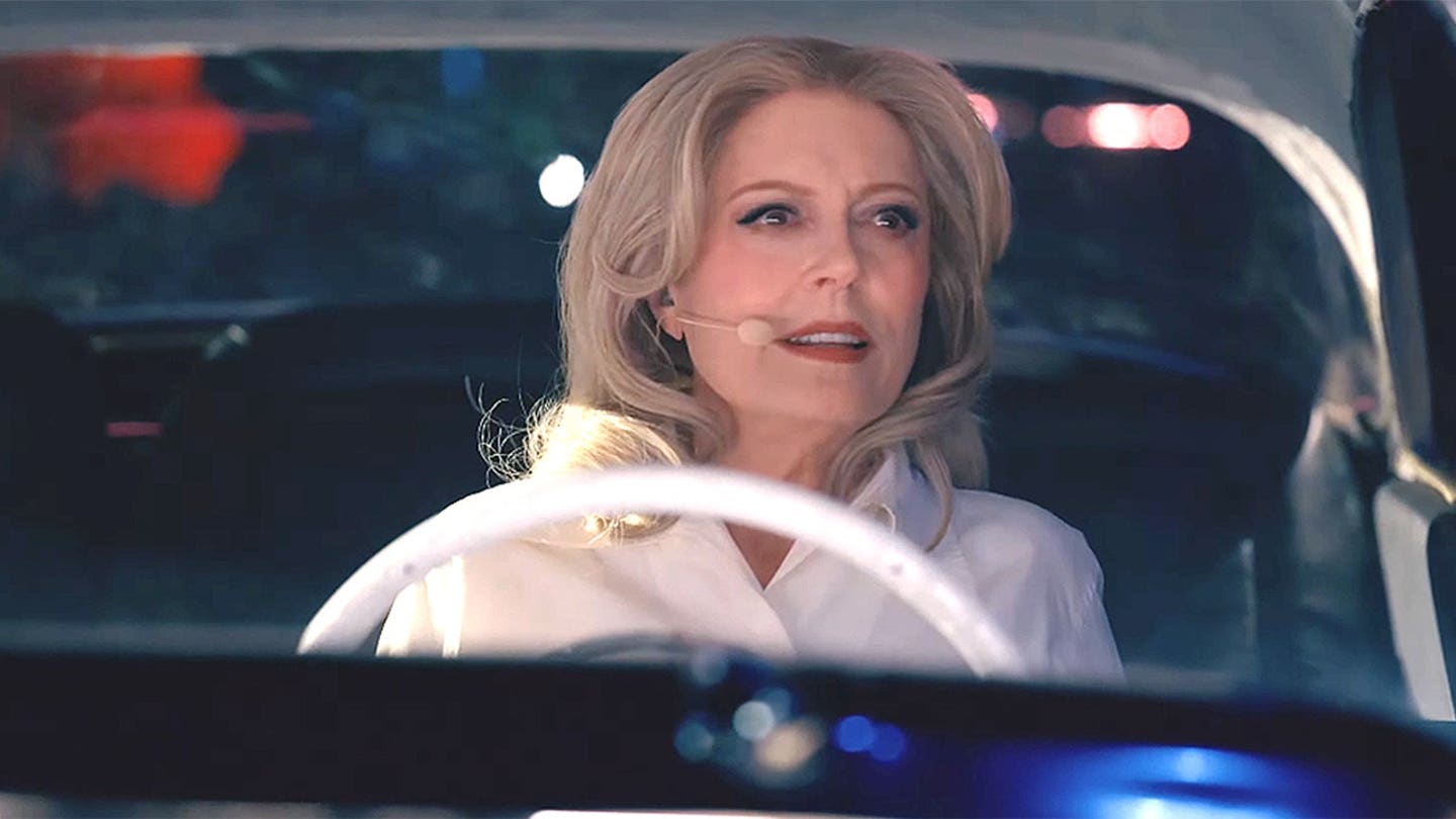 Susan Sarandon estava sentada ao volante de um carro velho, vestindo uma blusa branca e um microfone headset. (Coachella/YouTube)