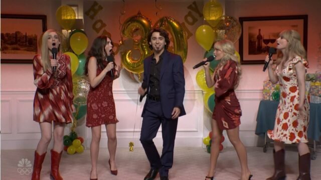 A cantora de “Manchild” voltou ao show noturno de sábado, onde atuou como apresentadora e convidada musical. A abertura fria começou com outro retorno ao lar da personagem Kelsey de Chloe Fineman e seu grupo de melhores amigos, incluindo Carpenter.