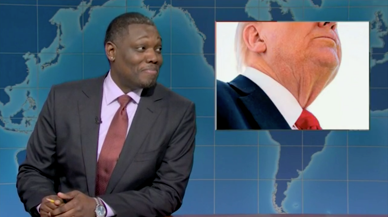 O co-apresentador Michael Che comentou sobre a aparição de Trump na capa da Tempo Revista com a qual ele não gostou e foi zombado inclusive do governador da Califórnia, Gavin Newsom.