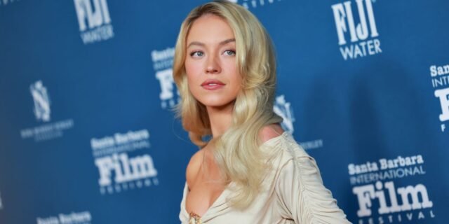 Sweeney usava seus cabelos loiros em ondas soltas, enquanto sua maquiagem consistia em delineador enrolado e lábios nude.