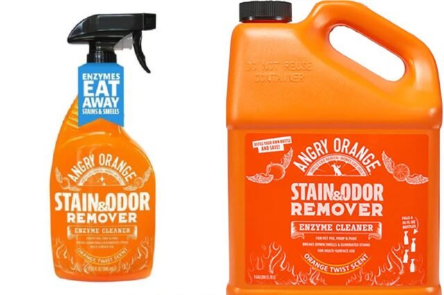 Os frascos são dourados e brancos, com “Angry Orange” e “Stain & Odor Remover” claramente impressos na frente.