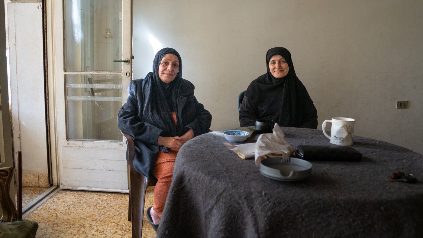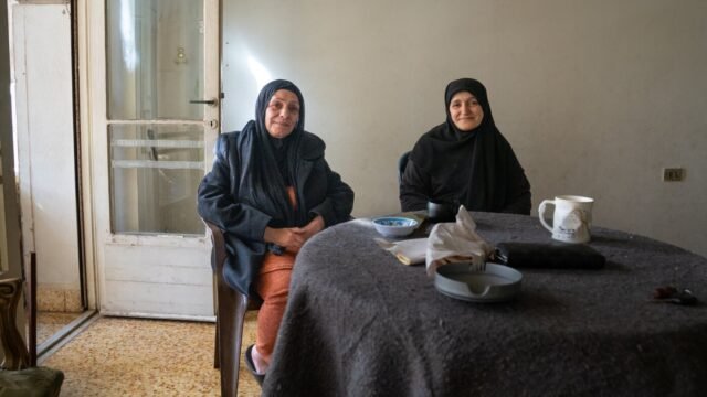 Mariam Allawiya, 60 (esquerda), e Kafa Wehbe, 67, instalaram-se juntas num edifício vazio no centro de Beirute depois de terem sido deslocadas do sul do Líbano pela actual invasão israelita. Ambos cresceram no sul do Líbano, e o filho de Allawiya casou-se com a filha de Wehbe.