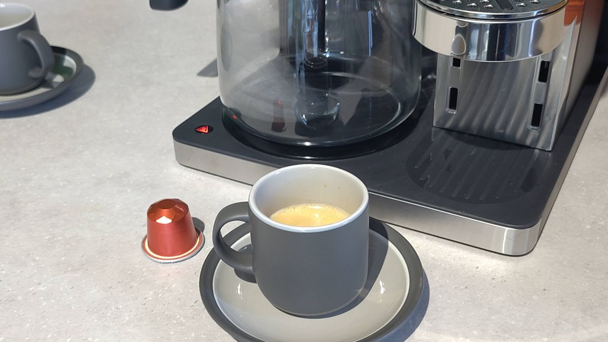 O sistema Ninja Prestige DualBrew é metade cafeteira e metade Nespresso, tornando-o seu novo melhor amigo pela manhã. Como todas as minhas máquinas de gotejamento top de linha, este dispositivo possui um cronômetro para que você possa ajustá-lo à noite e acordar de manhã com uma xícara de café acabado de fazer. Para um sabor mais forte, adicione uma cápsula de café expresso (compatível com as cápsulas Nespresso Original), escolha entre dois tamanhos de bebida e você terá um delicioso café expresso em menos de um minuto.