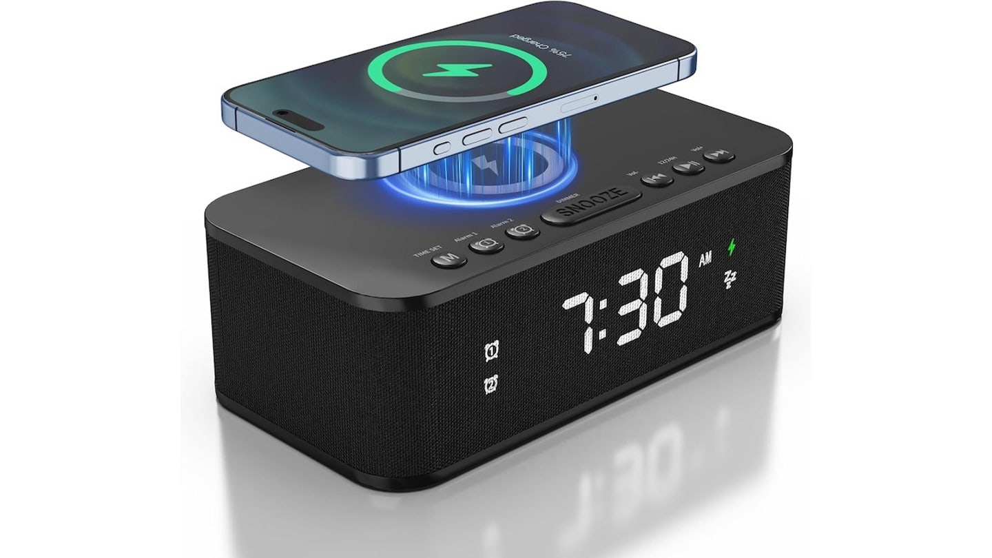 Este é um despertador digital Vem com opção de carregamento sem fio e porta USB. Coloque seu telefone em cima do alarme e ele começará a carregar. Ideal para casais, você pode definir alarmes duplos que coincidem com os horários de ambos. Escolha entre seis sons de alarme diferentes e ajuste o volume inicial para acordar suavemente. Há também uma máquina de som embutida com 23 sons suaves para ajudá-lo a relaxar e adormecer. Se você quiser seu próprio som, o despertador possui um recurso Bluetooth. Conecte-se ao seu telefone e reproduza suas músicas, audiolivros ou podcasts favoritos.