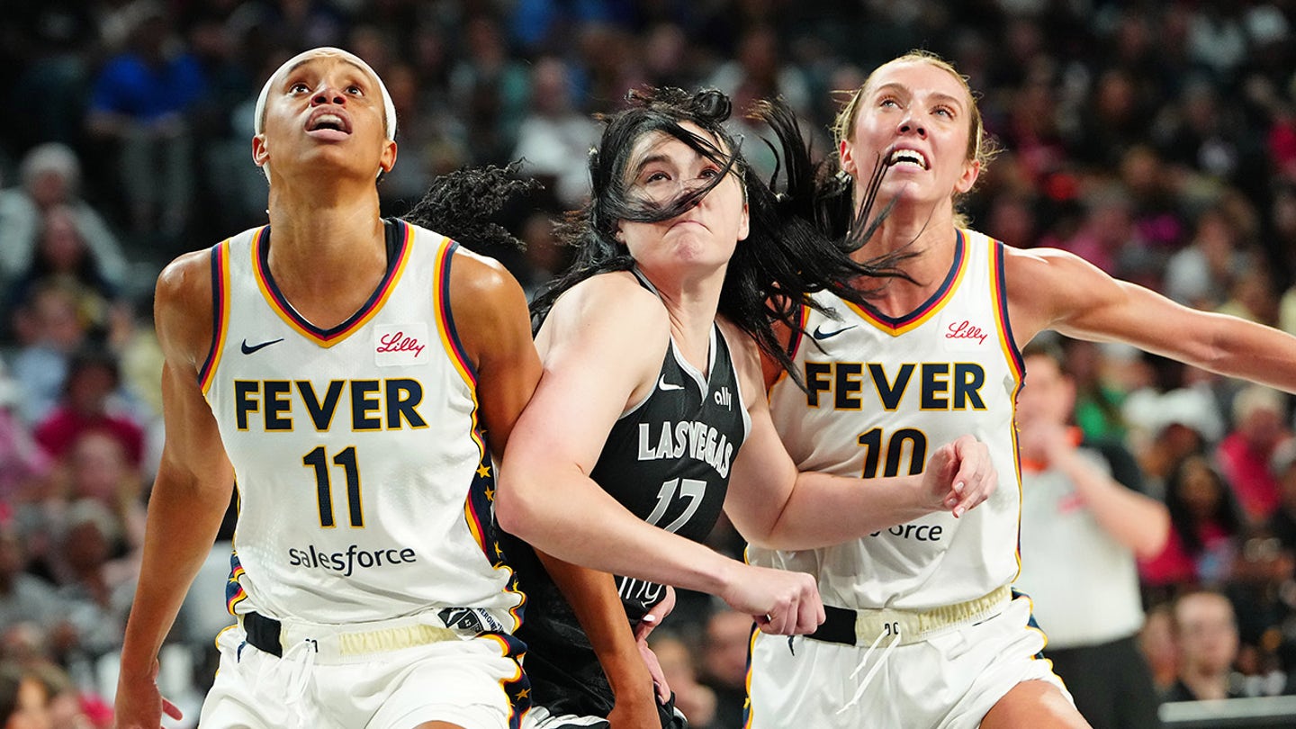 A pivô do Las Vegas Aces, Megan Gustafson (17), enfrenta a atacante do Indiana Fever Brianna Turner (11) e a guarda do Indiana Fever Lexi Hull (10) durante o terceiro quarto da segunda rodada dos Playoffs da WNBA de 2025 em 25 de setembro de 2025 em Las Vegas. (Stephen R. Silvani/Imagine Imagens)