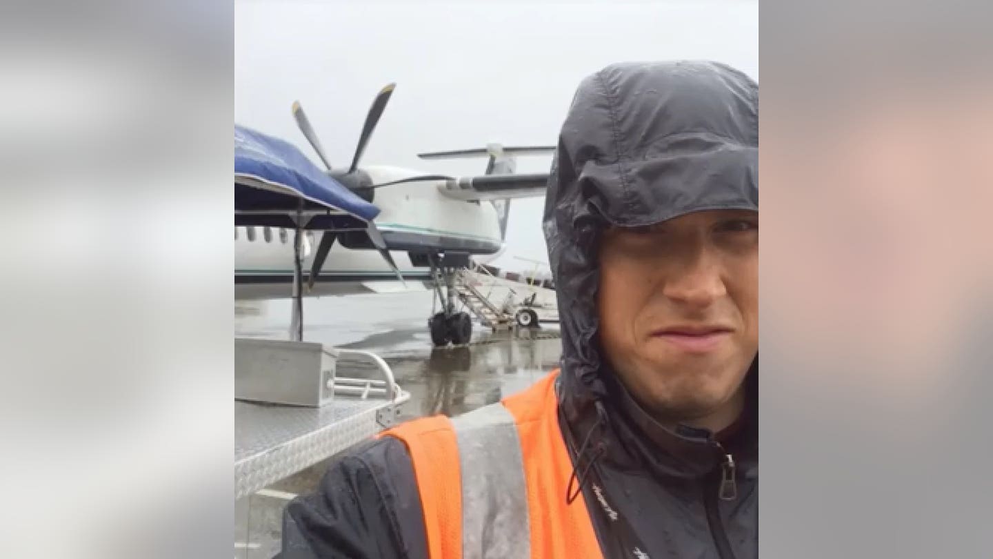 Richard Russell, funcionário da Horizon há três anos e meio, trabalhou como agente de serviço terrestre. Suas responsabilidades incluem puxar e empurrar aeronaves para decolagem e aproximação do portão, descongelá-las e manusear bagagens. (YouTube/Blog de Richard Russell)