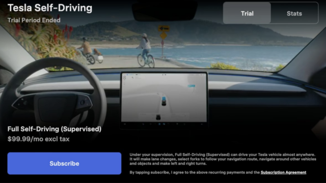 Entre os novos recursos está um novo aplicativo de direção autônoma que facilita a assinatura do pacote totalmente autônomo (supervisionado) da empresa com um único toque. O FSD não está disponível como compra única recentemente e atualmente está disponível apenas como uma assinatura de US$ 99,99/mês.