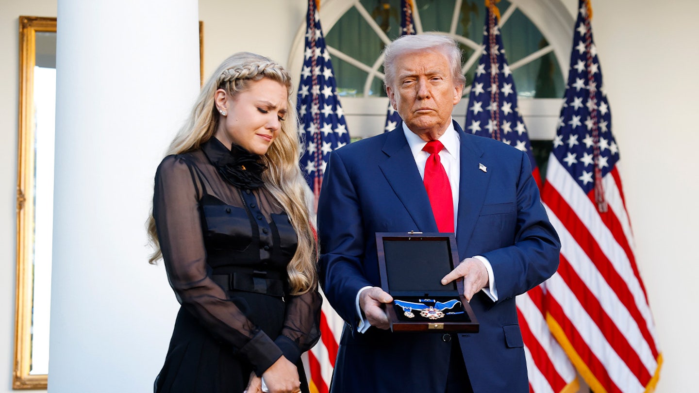 A esposa de Charlie Kirk, Erica Kirk, no dia 14 de outubro, aceitou a liberdade da medalha presidencial em nome do marido na Casa Branca no dia 14 de outubro. (FoxNotícias)