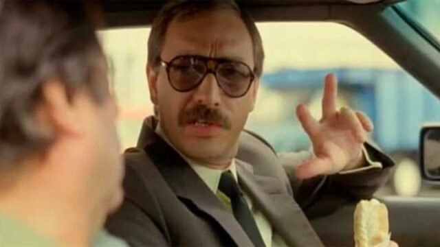 Mas o que importa aqui é a saída, que ocorre duas cenas depois. Brandoni desceu os degraus de um dos monoblocos cinza cor de cimento. Ele chega de terno e sapato branco, mascando chiclete e empanada na mão. Ele subiu no banco do motorista de seu carro esportivo Mazda RX-7 importado do Japão. Tenuta vem do lado do passageiro.