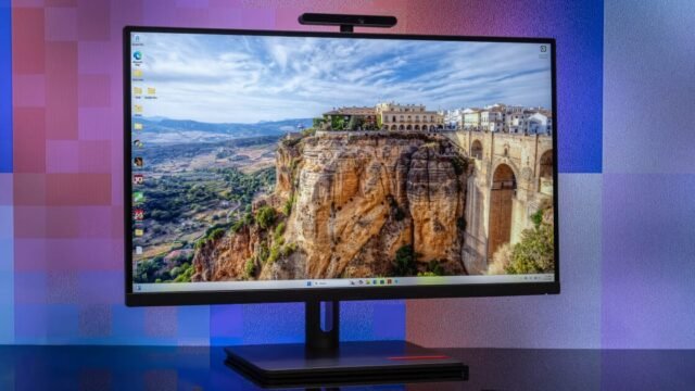 Visto de frente, o ThinkCentre M90a Pro Gen 6 se parece muito com um monitor de computador básico, com molduras pretas estreitas e uma combinação giratória de webcam/microfone montada na parte superior. O suporte é cinza escuro, com um recorte no lado direito da base para sustentar o smartphone e detalhes em vermelho que complementam a estética ThinkCentre da Lenovo. (Você também notará detalhes em vermelho nos botões de controle da tela na parte traseira do monitor, que imitam o navegador ThinkPad TrackPoint nos laptops Lenovo.)