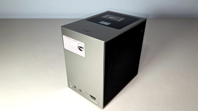 O CineBeam S oferece ao projetor um design físico exclusivo. Com 6,3 x 4,3 x 6,3 polegadas (HWD), parece uma câmera grande do início de 1900 ou anterior. Nesse caso, a lente está localizada na parte superior e não na frente e pesa 4,2 libras, o que a torna um pouco pesada para uma câmera. Além disso, o excelente ajuste e acabamento exclusivos da LG e o esquema de cores em dois tons de prata e preto adicionam uma aparência sofisticada e elegante.