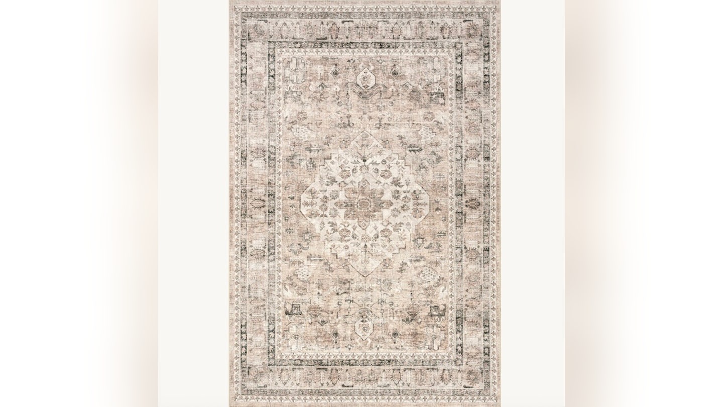 Esse Tapete de 8 por 10 pés Tem um visual bege com um toque vintage, mas foi feito para o uso diário. É à prova de derramamento, lavável na máquina e durável o suficiente para áreas movimentadas da casa.