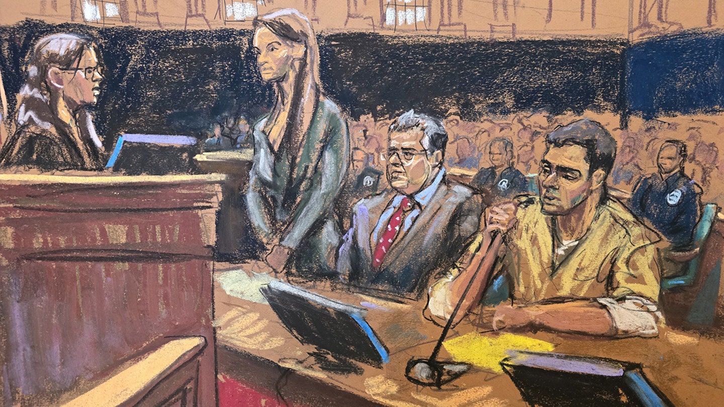 Um esboço de Luigi Mangione com seus advogados Karen Agnifilo e Mark Agnifilo perante a juíza Margaret Garnett em 1º de abril de 2026 em Manhattan, Nova York. Mangione estava sendo julgado pelo tiroteio em 2024 contra o CEO da UnitedHealthcare, Brian Thompson. (Jane Rosenberg/Desconhecido)
