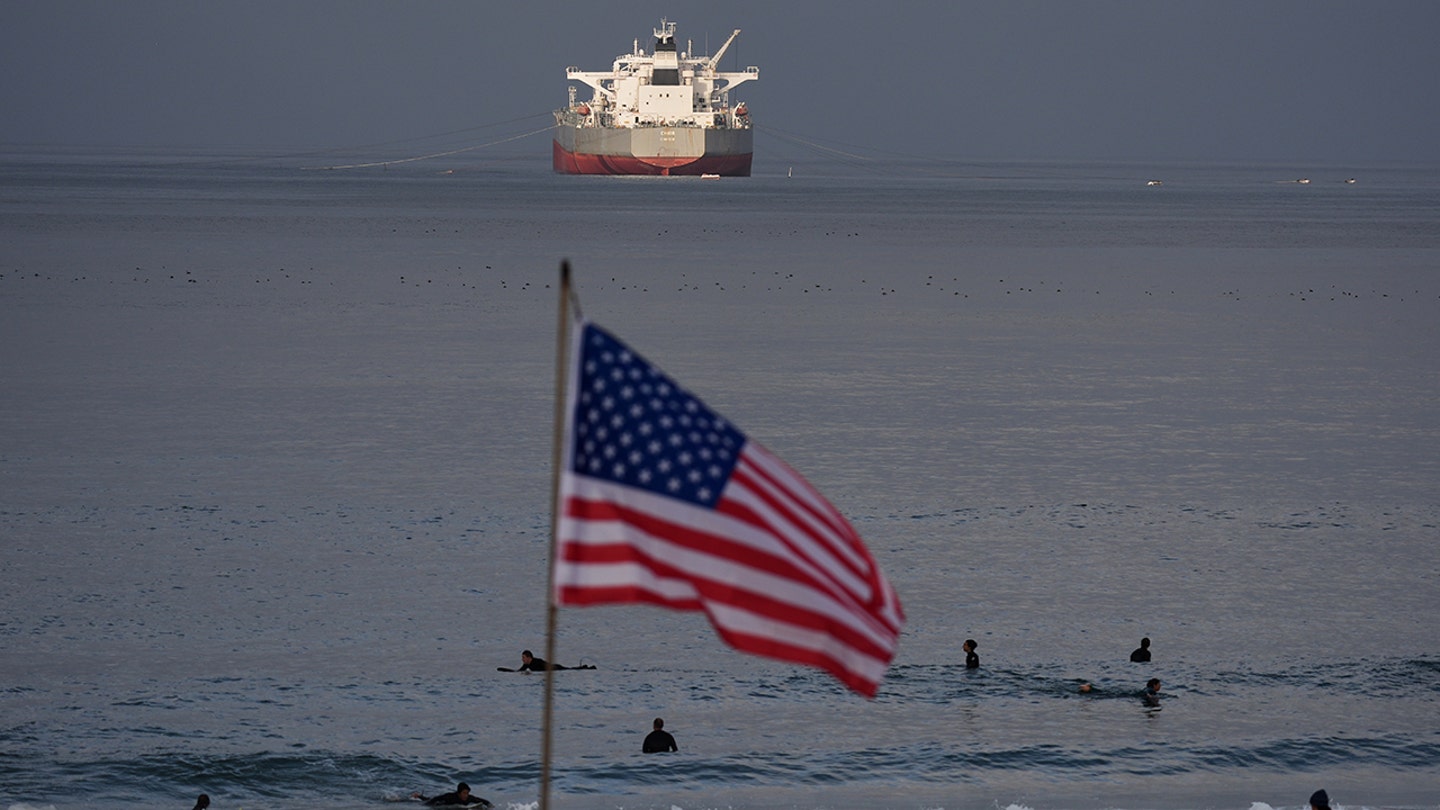 Surfistas esperam pelas ondas na praia de El Porto enquanto o petroleiro “Chios” bombeia sua carga para a refinaria da Chevron Products Company, uma das maiores instalações de processamento de petróleo da Califórnia, em 4 de março de 2026, em El Segundo, Califórnia. (Damian Doverganes/Foto AP)