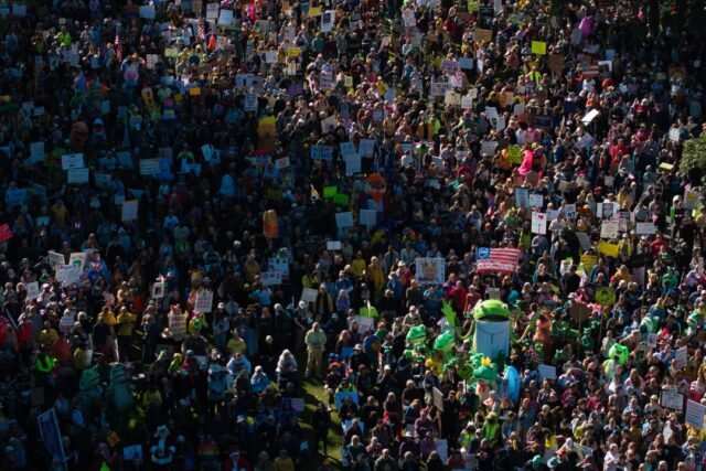 • A certa altura, as pessoas se reuniram no parque à beira-mar "Não há reis" Protesto em Portland, Oregon, no sábado, 18 de outubro de 2025. (AP Photo/Jenny Kane)