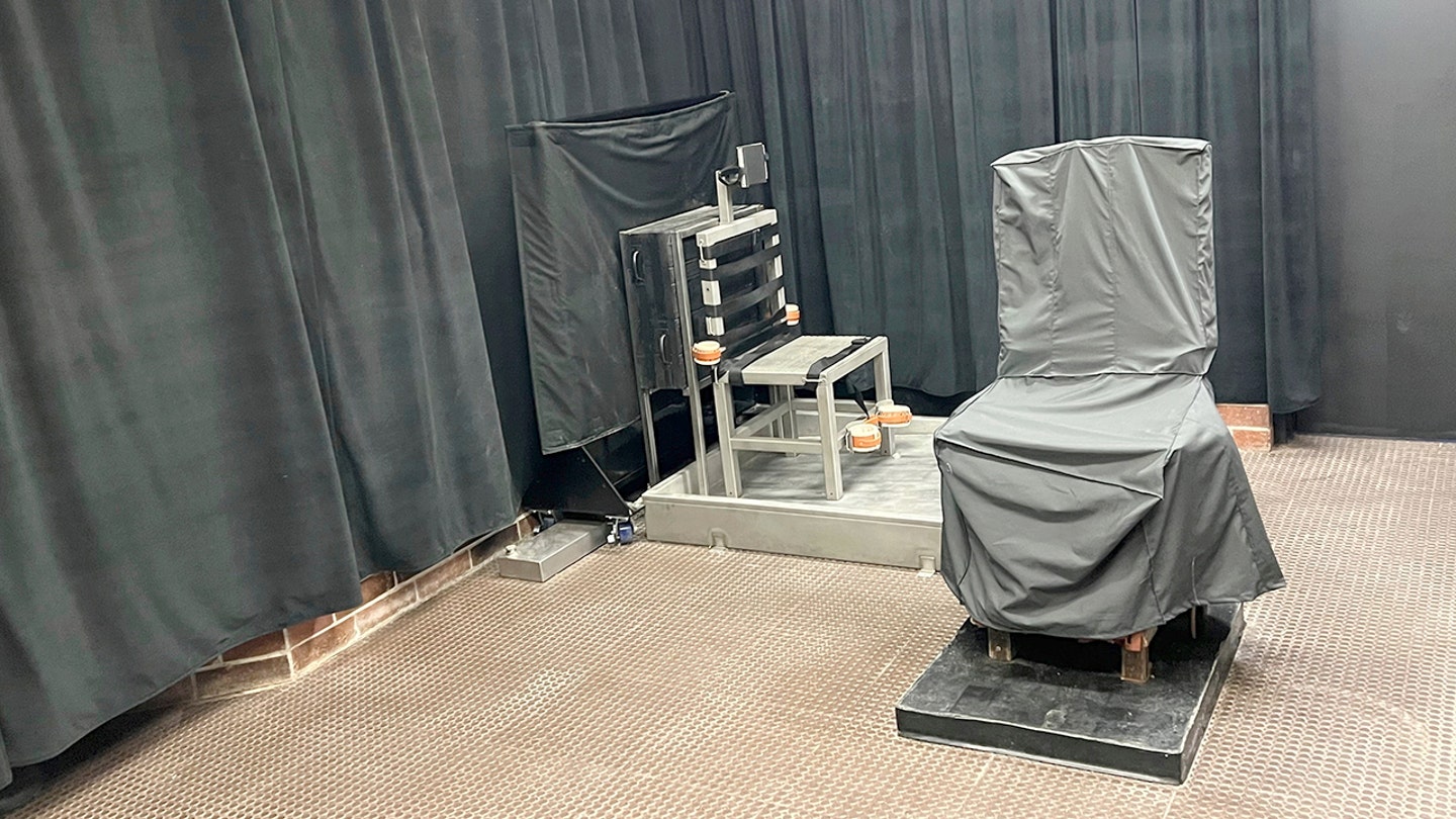 Esta foto fornecida pelo Departamento de Correções da Carolina do Sul mostra a câmara de morte estadual em Columbia, SC, incluindo a cadeira elétrica, à direita, e a cadeira do pelotão de fuzilamento. (via AP/Arquivo do Departamento de Correções da Carolina do Sul)