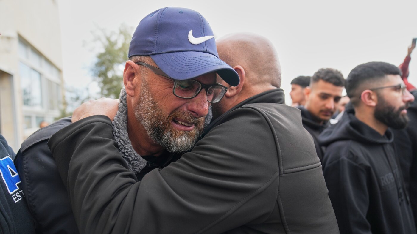 Os lutadores confortam Mohammad Abu Siyam, pai do palestino-americano Nasrallah Abu Siyam, 19, que foi morto a tiros por colonos na noite de quarta-feira, de acordo com o Ministério da Saúde palestino, durante seu funeral na rua Mukhmas, na Cisjordânia, a leste de Ramallah, na quinta-feira, 19 de fevereiro.