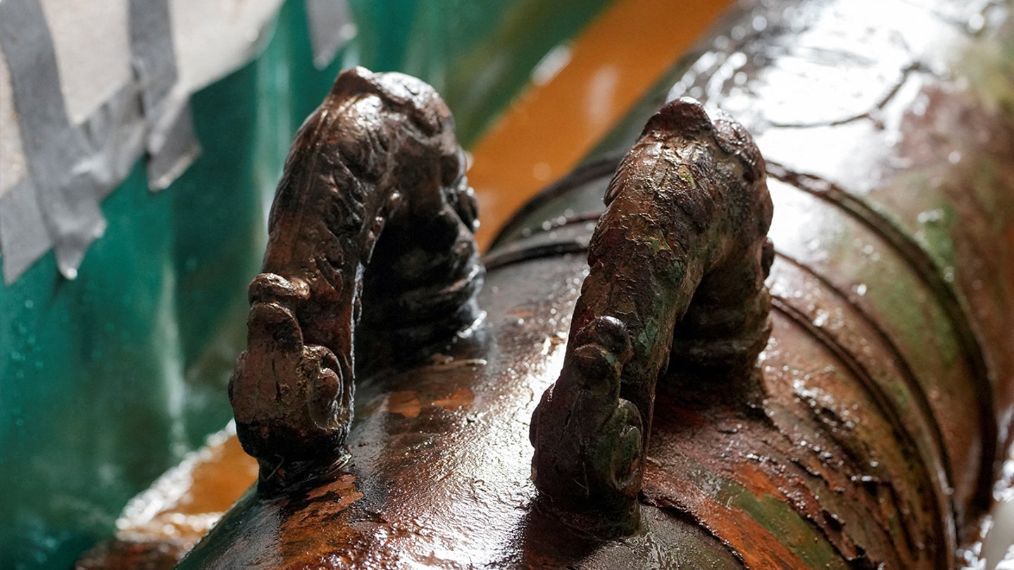 Entre os primeiros itens recuperados estavam uma xícara de porcelana, três moedas e um canhão de bronze excepcionalmente bem conservado. (Folheto via Presidência Colombiana/Reuters)