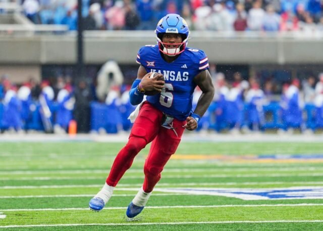 O Oklahoma State Cowboys enfrenta o Kansas Jayhawks em um jogo de futebol americano universitário no sábado, no David Booth Kansas Memorial Stadium.