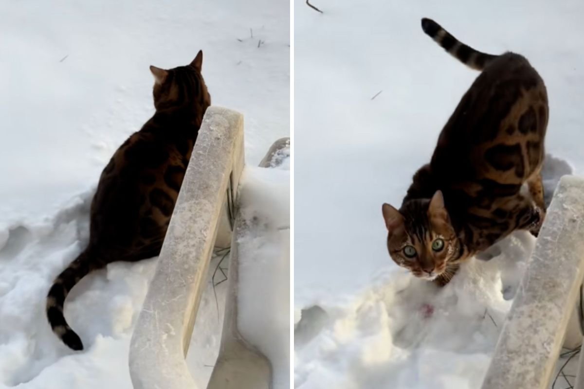 A proprietária Stacey permite que seu gato Bengal de 4 anos, Tony, aproveite a neve fresca do lado de fora de sua casa no Canadá no final de dezembro. Ela começou a filmar, e na fila ele resolveu cuidar da vida dele, mas felizmente ela continuou gravando, pois parecia uma “ervilha rosa”.