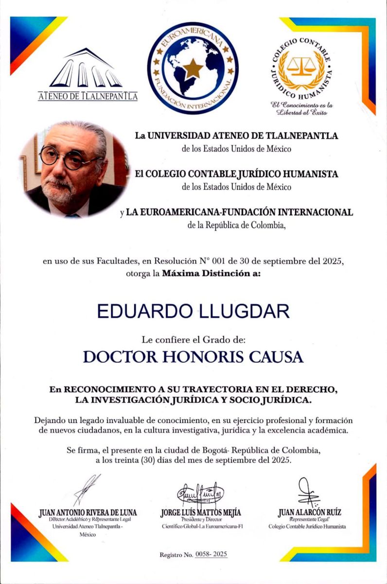 Quanto à identificação, o Dr. Lugdar disse: “Hoje gostaria de expressar minha gratidão à Universidade Ateneo de Talalnepantla do México, à Faculdade Humanista de Contabilidade Jurídica dos Estados Unidos do México e à Fundação Euroamericana-Internacional da Colômbia, especialmente ao Honorável Dr. Jorge Luis Mejia com o título de Hognoris Mejia ao Distinto Doutor. Minha carreira em direito e pesquisa jurídica e sócio-jurídica.”.