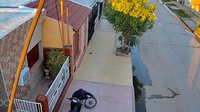O incidente foi registrado por câmeras de segurança. Mostra impunidade em que dois criminosos agem para retirar uma de suas rodas de uma motocicleta estacionada.