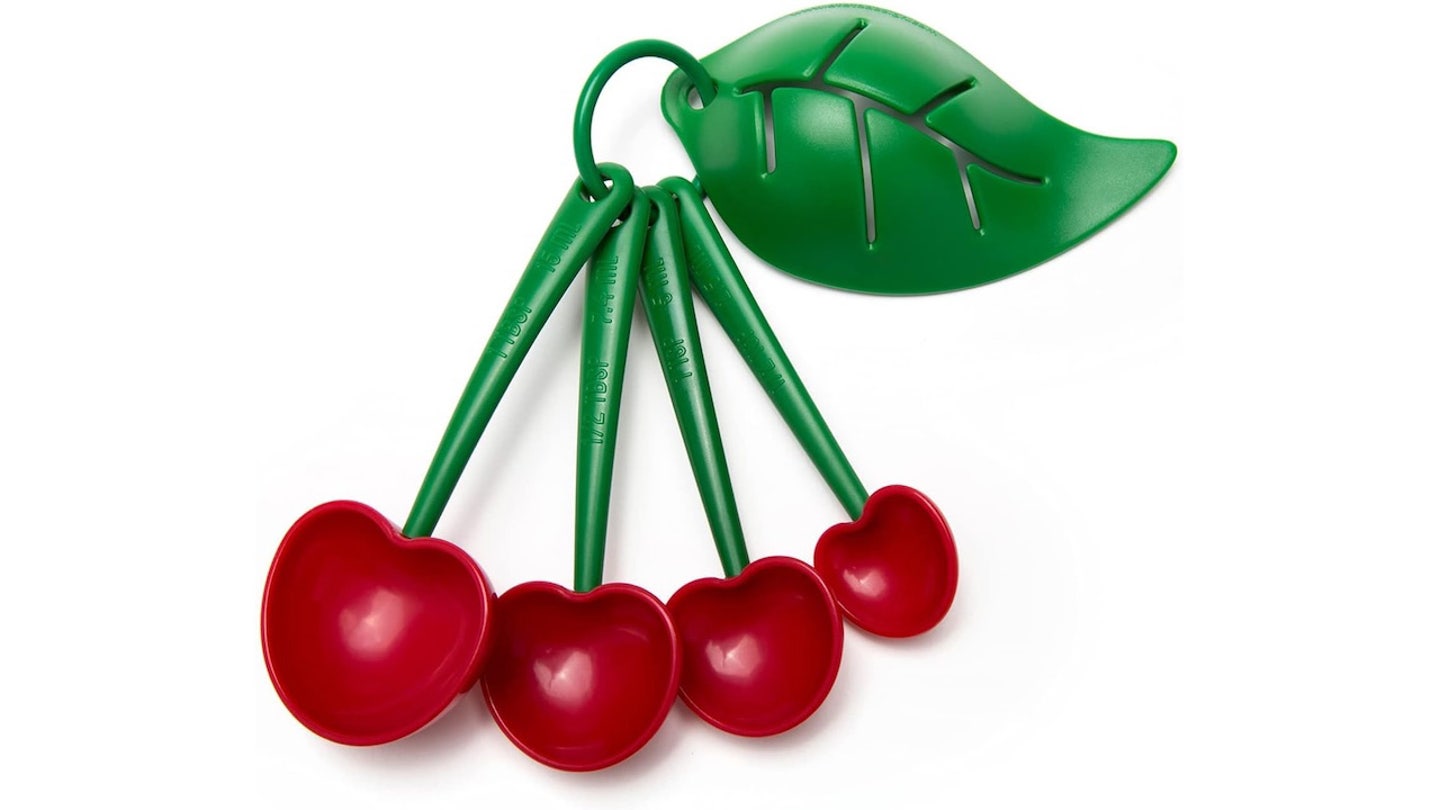 Esse Conjunto de colher medidora inspirada em cereja Bonito e útil. O caule da cereja também funciona como separador de ovos, tornando-o o multitarefa perfeito para padeiros.