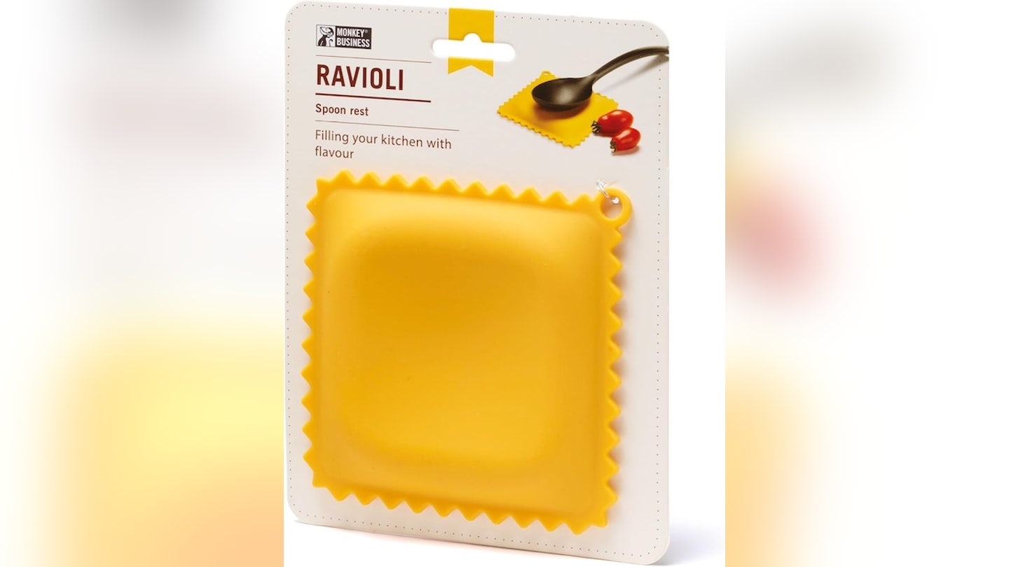 Esse Um descanso de colher gigante em forma de ravióli Feito de silicone durável e flexível. Ele mantém suas bancadas limpas e adiciona um toque agradável à configuração do fogão. O centro com covinhas retém gotas e sucos de cozimento, enquanto um ilhó embutido facilita pendurar quando não estiver em uso. É livre de BPA e pode ser lavado na máquina de lavar louça.