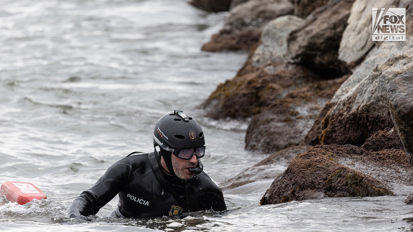 Um mergulhador da polícia catalã dos Mossos d’Esquadra faz uma busca na costa e na marina do Porto Olímpico em Barcelona, Espanha, quinta-feira, 19 de março de 2026. (James Breeden para Fox News Digital)