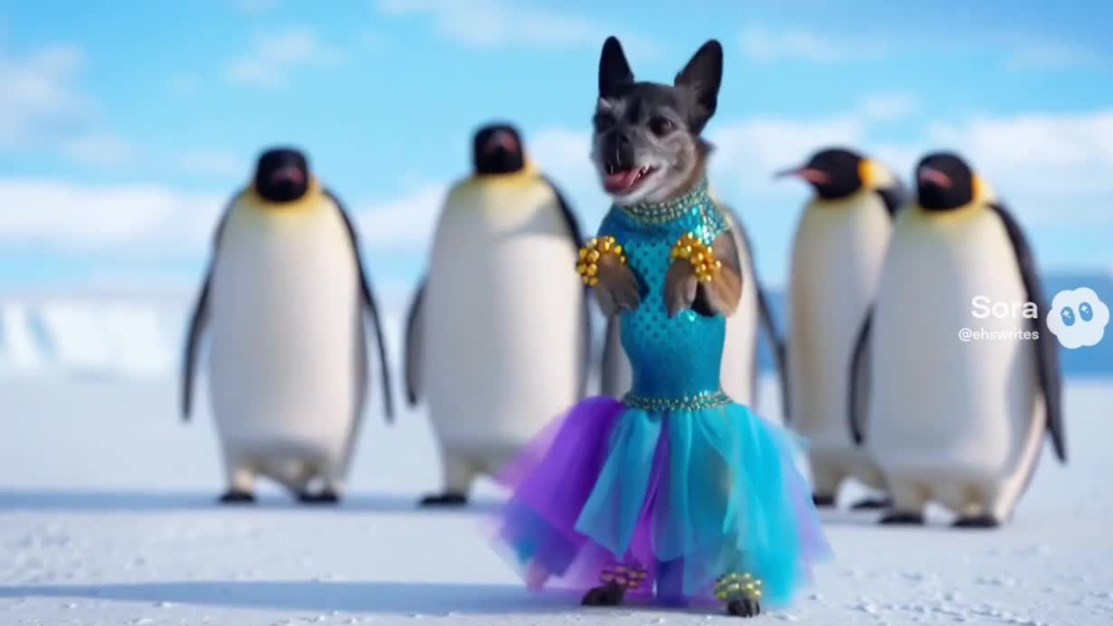 O primeiro teste foi usar um vídeo do meu cachorro Cabbage correndo. Ela é muito ágil então decidimos nos divertir e fazer dela uma dançarina orgulhosa. Por nenhuma outra razão a não ser para ver o que aconteceria, fiz com que Sora se preparasse para se apresentar diante de um grupo de pinguins na Antártica. Eu apenas especifiquei que ela estava usando uma “roupa de dança divertida”. A IA decidiu que isso significava Capades de Gelo e Pulseira.