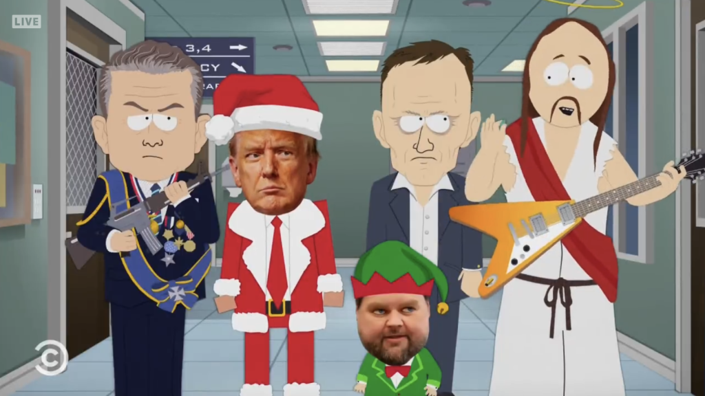 Enquanto isso, Jesus chega para salvar Trump e o ajuda a tirar Thiel da prisão. “Isso é feito como um grande homem que protege o país dos af*gs”, observa Cristo como Stan, “tudo é cristão agora.