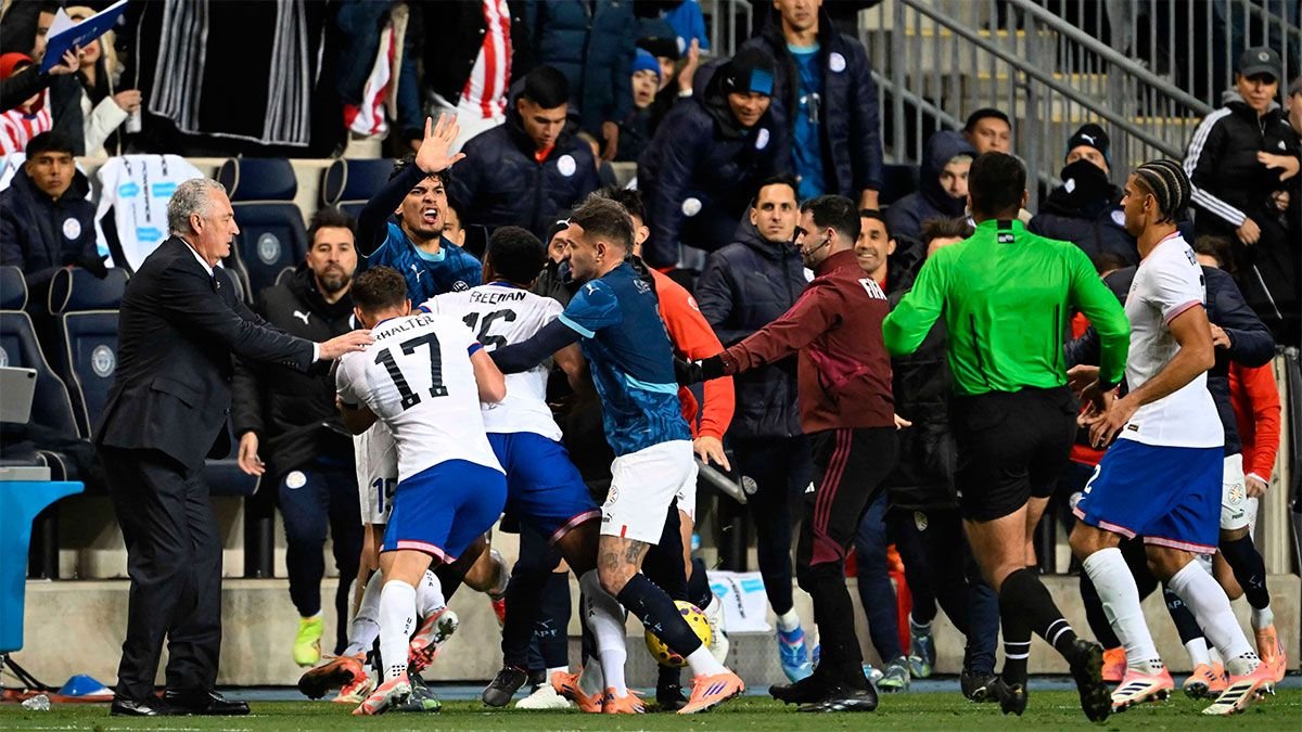 EUA Ele perdeu 2-1 um Paraguai Nisso Subaru Parque de ChesterEmbora o resultado tenha sido completamente ofuscado pelo escândalo que eclodiu durante a paralisação. O que começou como um movimento sem riscos terminou em uma luta massiva Gustavo Gomes Como protagonista, Alex Freeman Bocas ensanguentadas e jogadores de futebol dos dois times – assim como membros da comissão técnica – desferiram golpes no meio do campo.