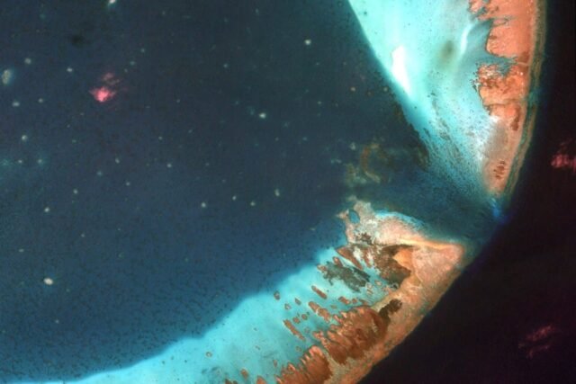 A barreira é visível em foto tirada e divulgada no dia 8 de outubro Imagens de satélite SkFi é o fornecedor do analista marinho Ray Powell, que lidera o grupo de análise Sealight, afiliado à Universidade de Stanford.