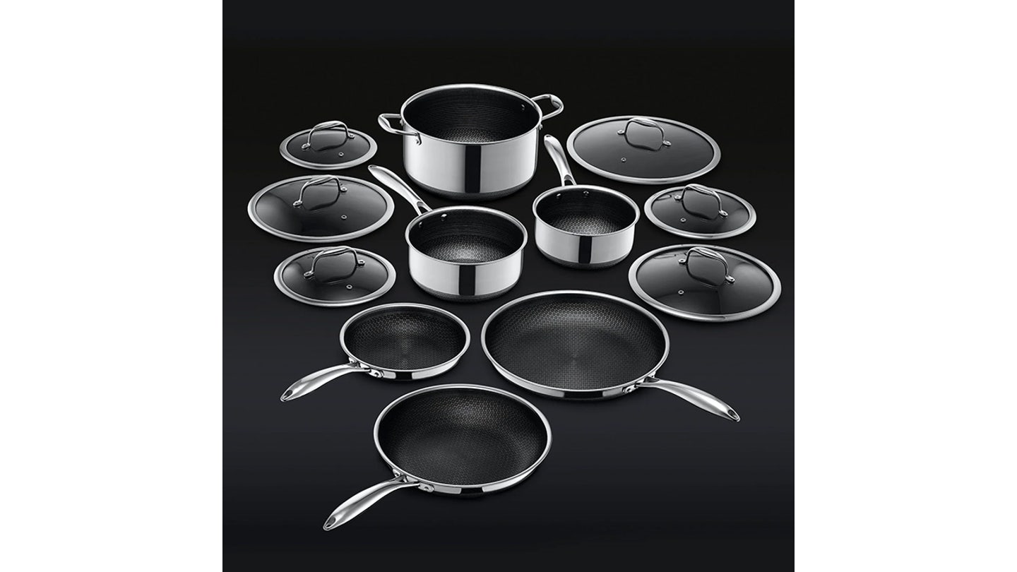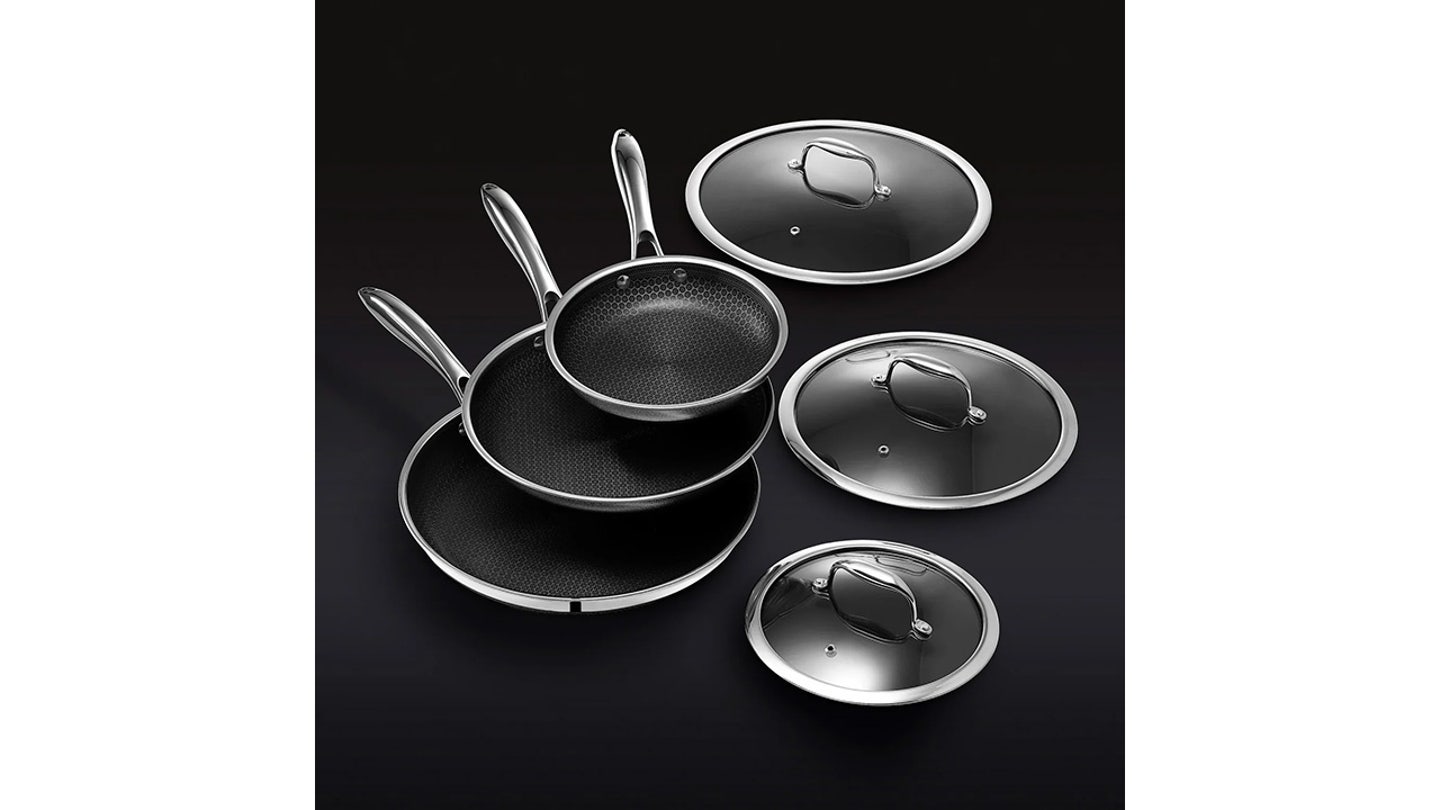 Isso inclui todas as frigideiras do hexclad Defina uma panela de seis peças. Este conjunto vem com panelas de 12, 10 e 20 polegadas, e cada uma vem com tampas. As panelas podem guardar utensílios metálicos, enxaguar na máquina de lavar louça e ir ao forno até 900 graus (400 graus para tampas). As rupturas do aço fragmentado proporcionam séries incríveis, mas o revestimento anti-tempestade é facilmente limpo.