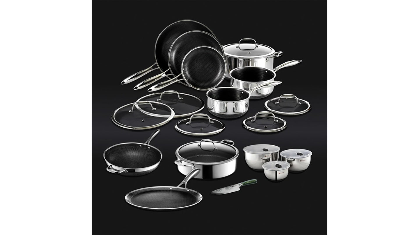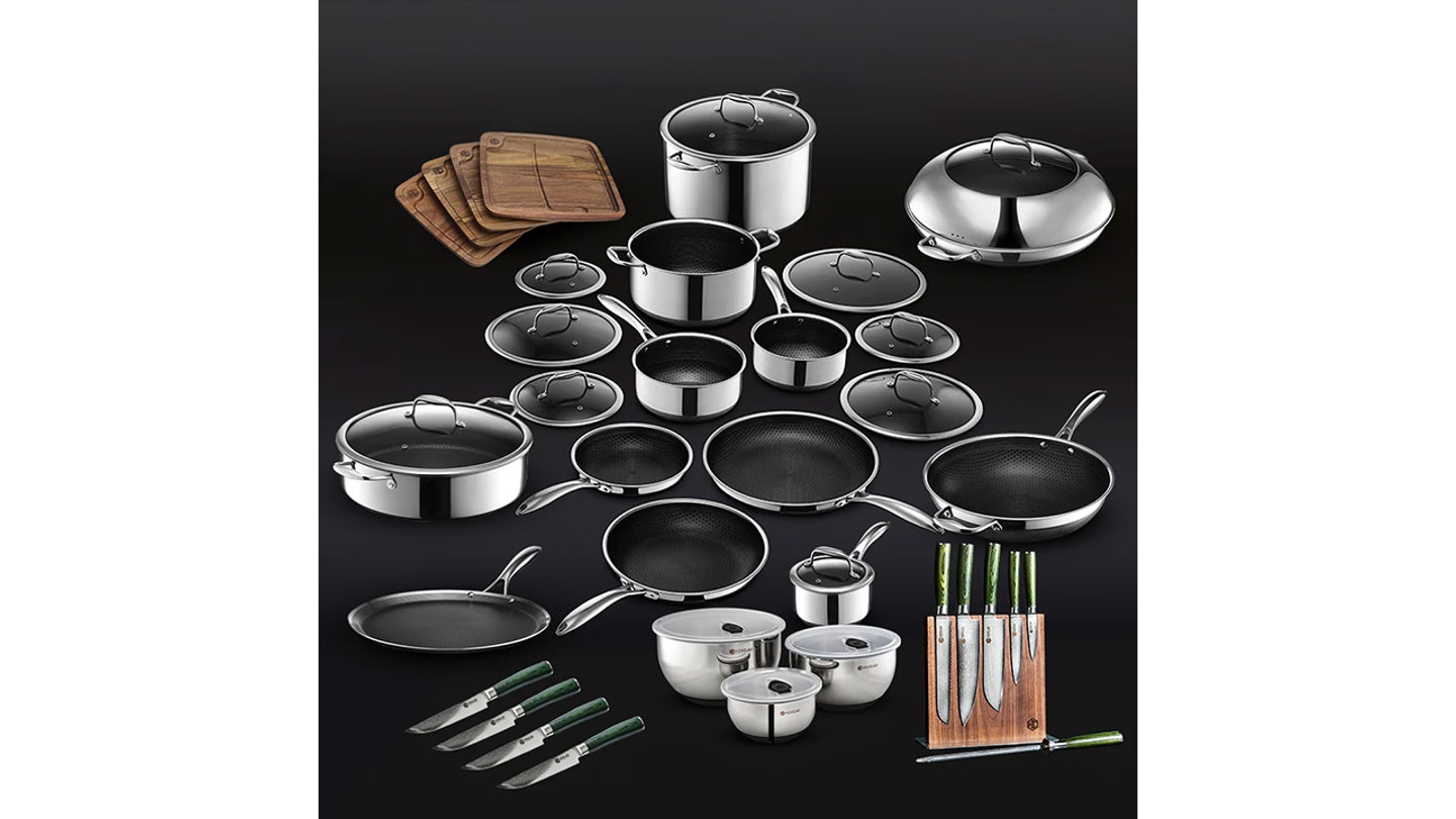 Se você não está pronto para gastar 000 4.000 em toda a configuração da sua cozinha, você pode obter Hexclad é a coleção definitiva do melhorEle vem com todos os requisitos que a maioria das pessoas deseja levar para casa. Você obtém uma frigideira híbrida e um conjunto de panelas, com todas as tampas. Essas panelas e frigideiras vêm com uma mistura de aço inoxidável e tecnologia antiaderente, que também são fáceis de cozinhar e limpar. Há também um conjunto de espadas de aço Damasco e um conjunto de facas de carne. Você precisa de tigelas para completar sua configuração, e este conjunto vem com seis.