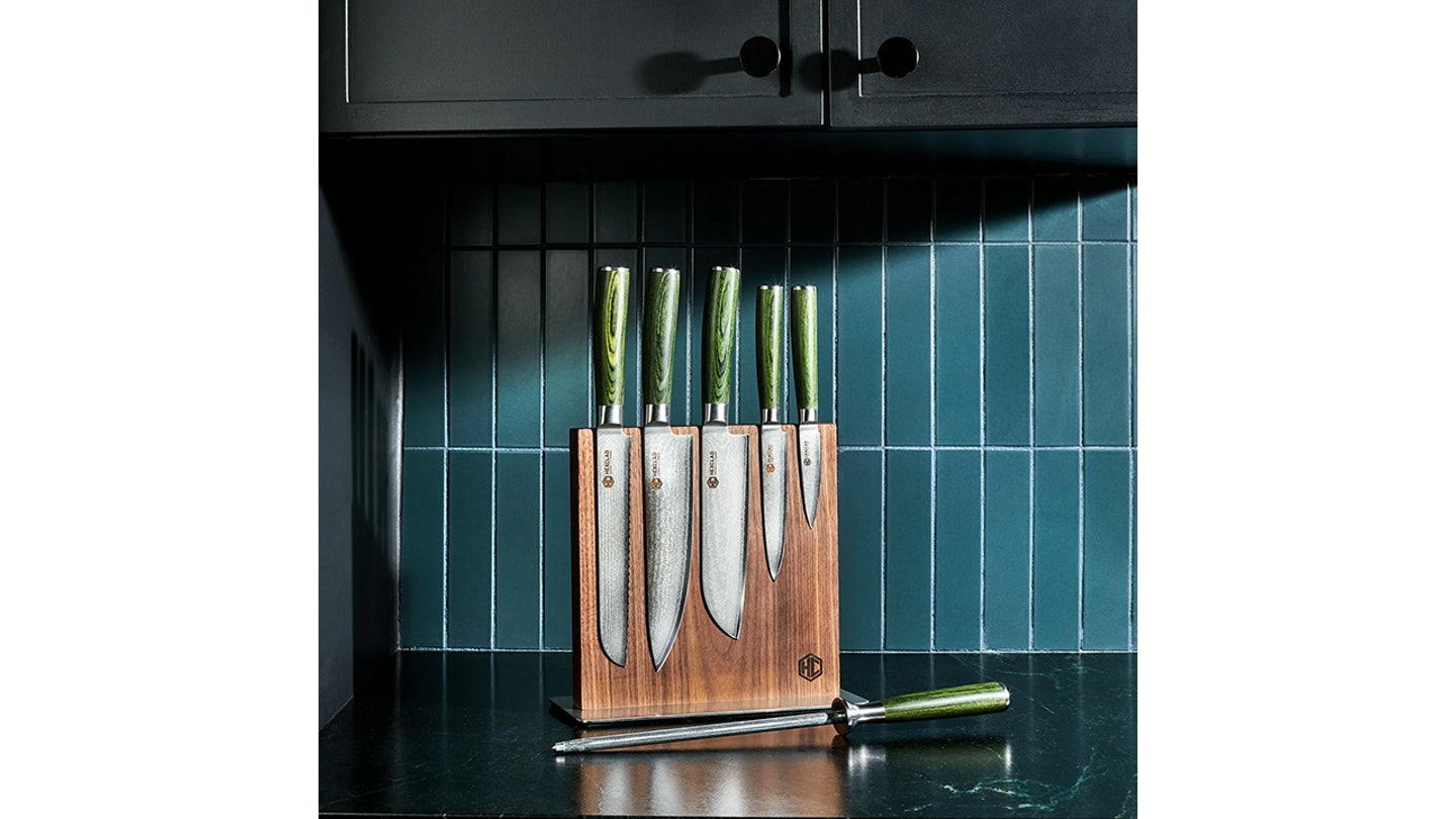 Para um belo conjunto de facas afiadas, Sete peças do conjunto de sete peças de espada de aço de Damasco de hexclad Não decepciona. Cada um é feito de 67 camadas de aço Damasco resistente, o que reduz tudo. Você ganha uma faca de chef, uma faca serrilhada, uma faca para Santo, várias lâminas utilitárias e uma haste de afiar. Cada faca tem um cabo de madeira verde incrível, que é igualmente durável como uma lâmina. Amarre todo o conjunto com o bloco magnético de nogueira, que mantém todas as espadas seguras. Você também pode Obtenha o mesmo conjunto com alças coloridas de café expresso.