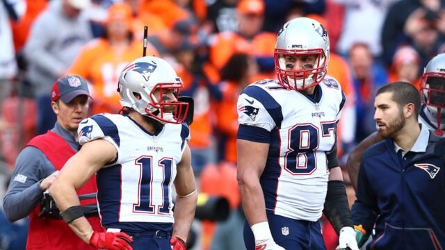O wide receiver do New England Patriots Julian Edelman (11) e o tight end Rob Gronkowski (87) contra o Denver Broncos no AFC Championship Game no Sports Authority Field em Mile High. (Mark J. Rebellas/USA TODAY Sports)