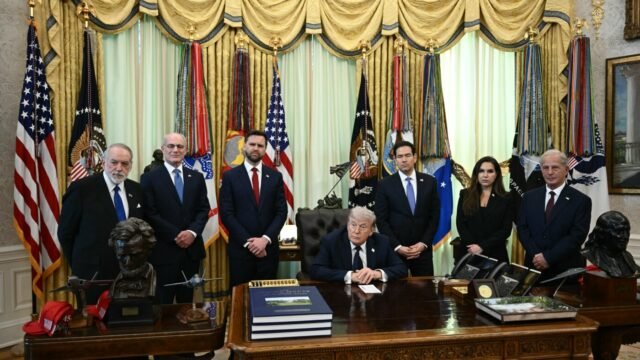 A partir da esquerda: Embaixador dos EUA em Israel Mike Huckabee, Embaixador dos EUA em Israel Yechiel Leiter, Vice-presidente Vance, Presidente Trump, Secretário de Estado Marco Rubio, Embaixador do Líbano nos EUA Nada Hamadeh Moawad e Embaixador dos EUA no Líbano Michel Issa ouvem perguntas da mídia na Casa Branca em Washington, DC, na quinta-feira.