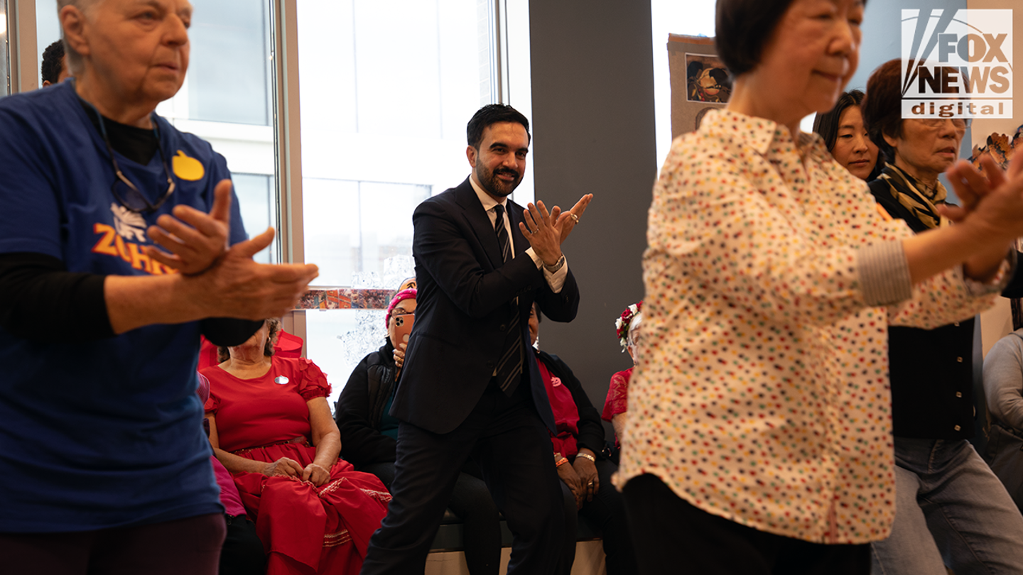 O candidato democrata a prefeito de Nova York, Zohran Mamdani, dança tai chi com idosos no Lower East Side de Manhattan na sexta-feira, 31 de outubro de 2025. (Fox News Digital/Deirdre Heavy)