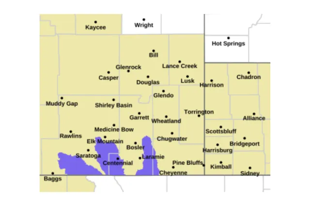 Para Sierra Madre e Snowy Ranges, um aviso de clima de inverno permanece em vigor até o meio-dia de terça-feira. É possível acumular entre 15 e 25 centímetros de neve, com quantidades maiores em altitudes mais elevadas.