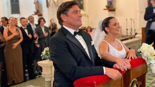 Matías Alé chega vestido com um smoking eleganteacompanhante RioEle divide um bassê com sua esposa Martina está amarrada com um vestido branco de Benito Fernándezcom linhas clássicas e detalhes românticos. diante do altar, eles fazem um juramento que significa amor eterno “perpétuo”.