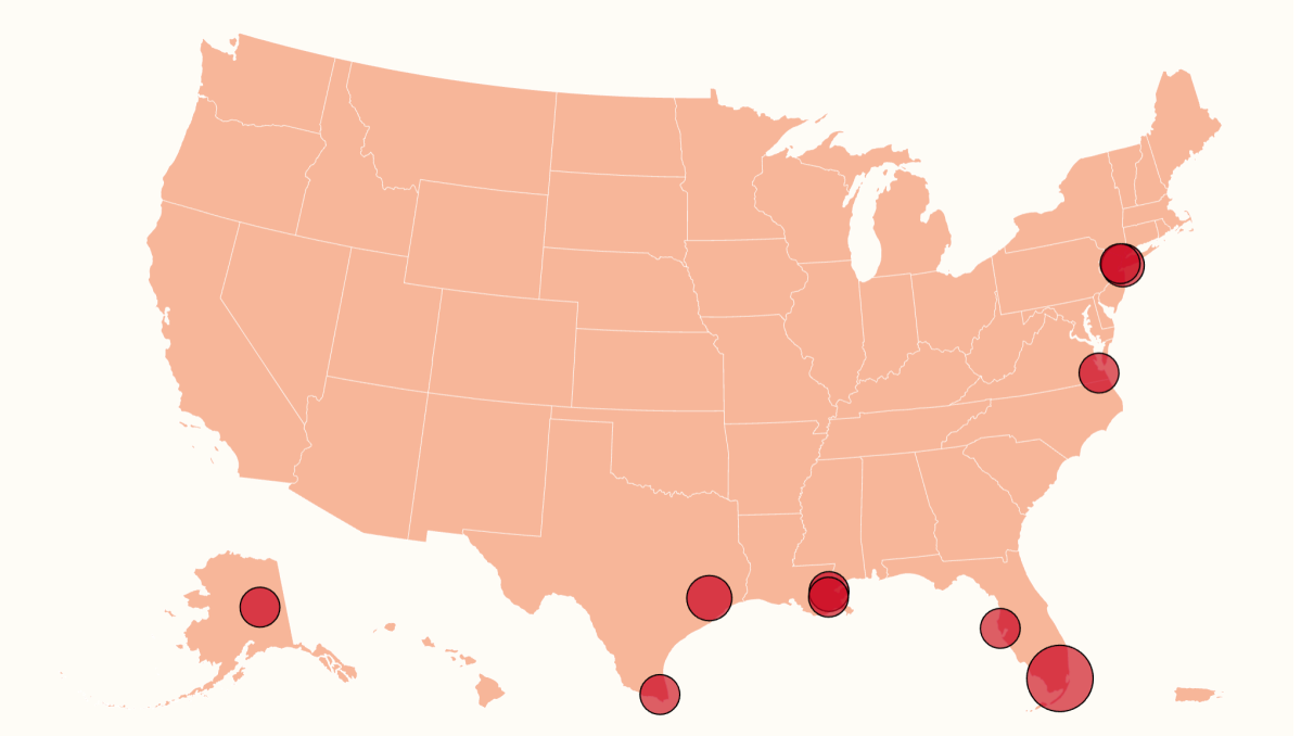 O condado de Harris, Texas, onde fica Houston, teve uma perda líquida de 31.165 residentes. O condado de Kings, em Nova York, onde fica o Brooklyn, ficou em terceiro lugar, com um fluxo líquido de 28.158 residentes. A Paróquia de Orleans, Louisiana, seguiu com uma perda líquida de 4.950 residentes. Aqui, 99,1 por cento dos agregados familiares enfrentam um elevado risco de inundações – a percentagem mais elevada do país.
