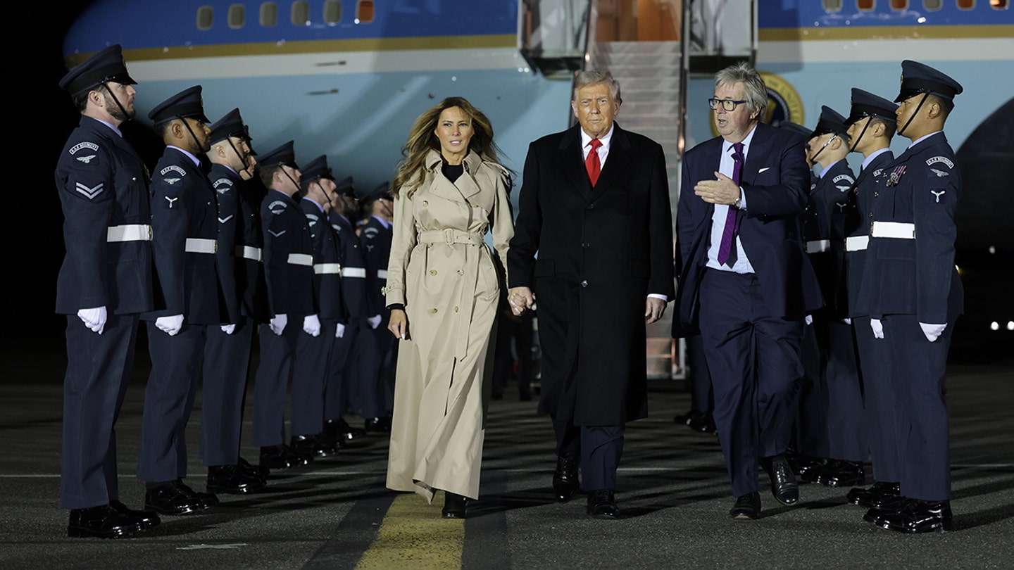 O presidente Donald Trump e a primeira-dama Melania Trump desembarcam do Força Aérea Um após chegarem ao Aeroporto Stansted de Londres para uma visita de estado em 16 de setembro de 2025 em Stansted, Essex. (Anna Moneymaker/Getty Images)
