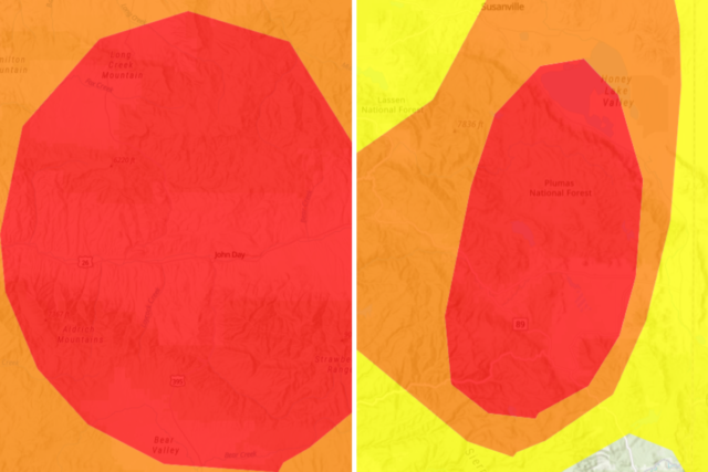 A partir das 2h45 (ET) de domingo, 18 de janeiro, milhares de residentes em partes da Califórnia, incluindo Portola e Oregon, foram aconselhados a permanecer em casa, pois os níveis de poluição por partículas finas (PM2,5) atingiram níveis “prejudiciais”. Mapa AirNowProduzido pela Agência de Proteção Ambiental (EPA).