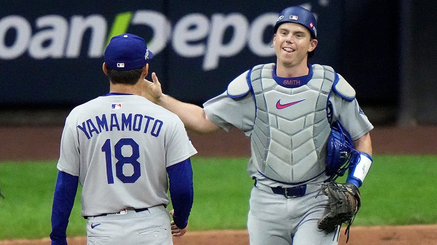 O apanhador do Los Angeles Dodgers, Will Smith, e Yoshinobu Yamamoto comemoram após o jogo 2 da National League Championship Series do beisebol contra o Milwaukee Brewers. O jogo aconteceu em 14 de outubro de 2025 em Milwaukee, Wisconsin. (Morrie Gasch/Foto AP)
