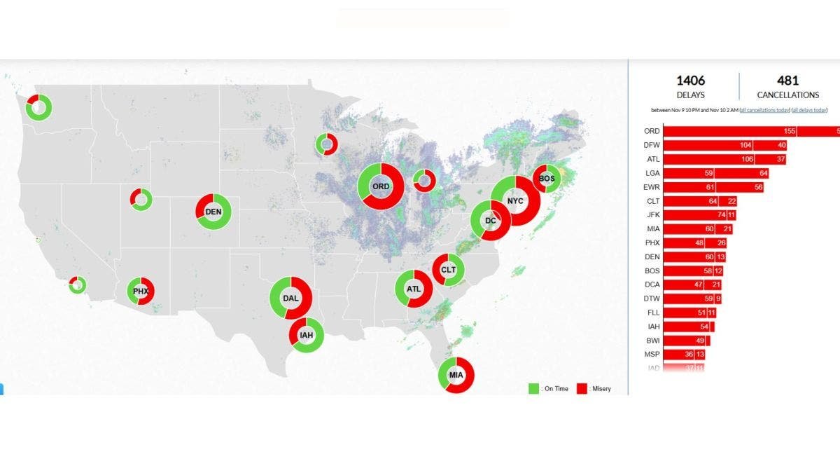 O Misery Map da FlightAware mostra o número de atrasos e cancelamentos em horários específicos ao longo do dia com base em um período de quatro horas, duas horas antes e depois de um horário específico.